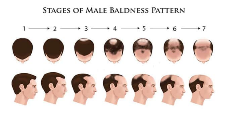 - In advanced baldness, the front, crown, or mid-scalp often lose all hair.